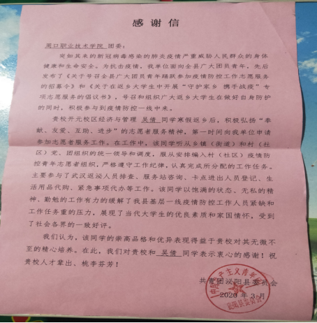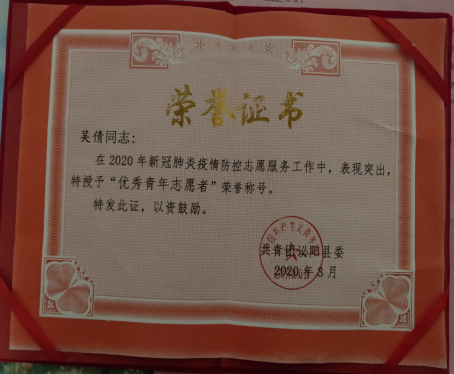 作为一名大学生志愿者,在参与防疫工作期间,她一直对自己高标准严要求。积极向上、服务群众、奉献社会,将“奉献、友爱、互助、进步”的志愿者服务精神体现的淋漓尽致。以饱满的热情和无私的奉献精神展现了当代大学生的优良素质和家国情怀。志愿者工作结束后,吴倩同学受到了共青团泌阳的表彰,被授予“优秀青年志愿者称号”。