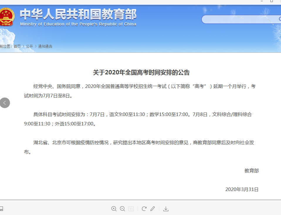 关于2020年全国高考时间安排的公告