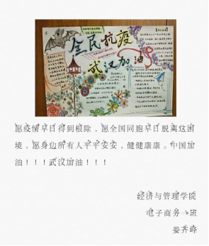 积极参与疫情防控的照片,精美的抗疫手抄报,饱含深情的诗句,为家人烹制的美食,同学们纷纷用自己的方式表达了对抗疫战士的敬佩,对强大祖国的热爱,对“抗疫”即将胜利的喜悦和春天到来的欢欣。