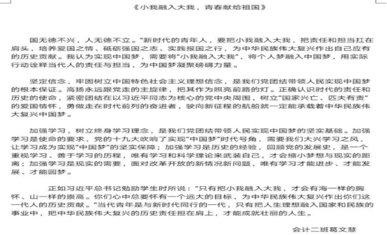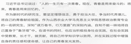 全国青联十三届全委会和全国学联二十七次代表大会让学生们深切的感受到了党和人民对青年的美好祝愿。作为新时代大学生,学生们坚信一定会将个人的梦想融入时代的洪流,小我融入大我,让青春的脚步紧随国家的脉动,不负党的期待和时代重托,脚踏实地、勤奋学习、努力成为新时代的奋进者和奉献者,为中华民族伟大复兴贡献自己的一份力量。