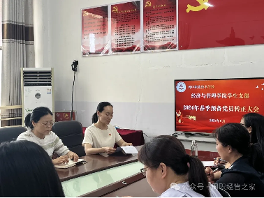 为进一步规范党员发展流程,提高党员发展质量。6月9日下午,经济管理学院学生支部在第四会议室召开2024年春季预备党员转正大会,大会讨论了刘雅雯等13位预备党员转正的相关事宜。学生党支部书记杨璐璐以及各入党介绍人参加会议。会议由杨璐璐老师主持。